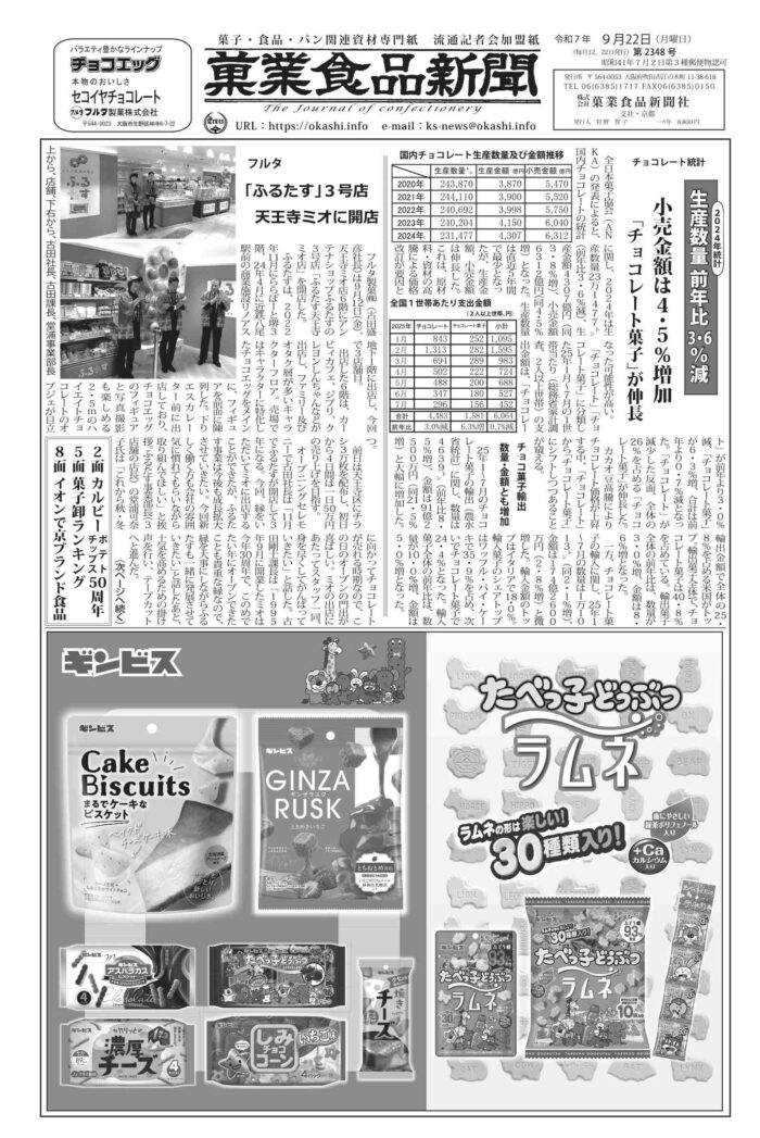 ホーム > 紙面紹介 > 9月22日号 2025/10/29 1面 チョコレート統計/フルタ製菓 ふるたす3号店 2面 カルビー「カルビーポテトチップス」発売50周年 3面 カカオ豆動向 インタビュー コンフィテーラ 4面 全国菓子工業組合連合会近畿ブロック会議/大阪府生菓子協同組合講習会 5面 2024年度菓子卸業調査 6面 カンロ カンロ飴70周年プロジェクト 7面 有力百貨店中元ギフト菓子結果/新製品 ギンビス・芥川製菓・MDホールディングス 8面 京都府食品産業協会 京ブランド食品フェア