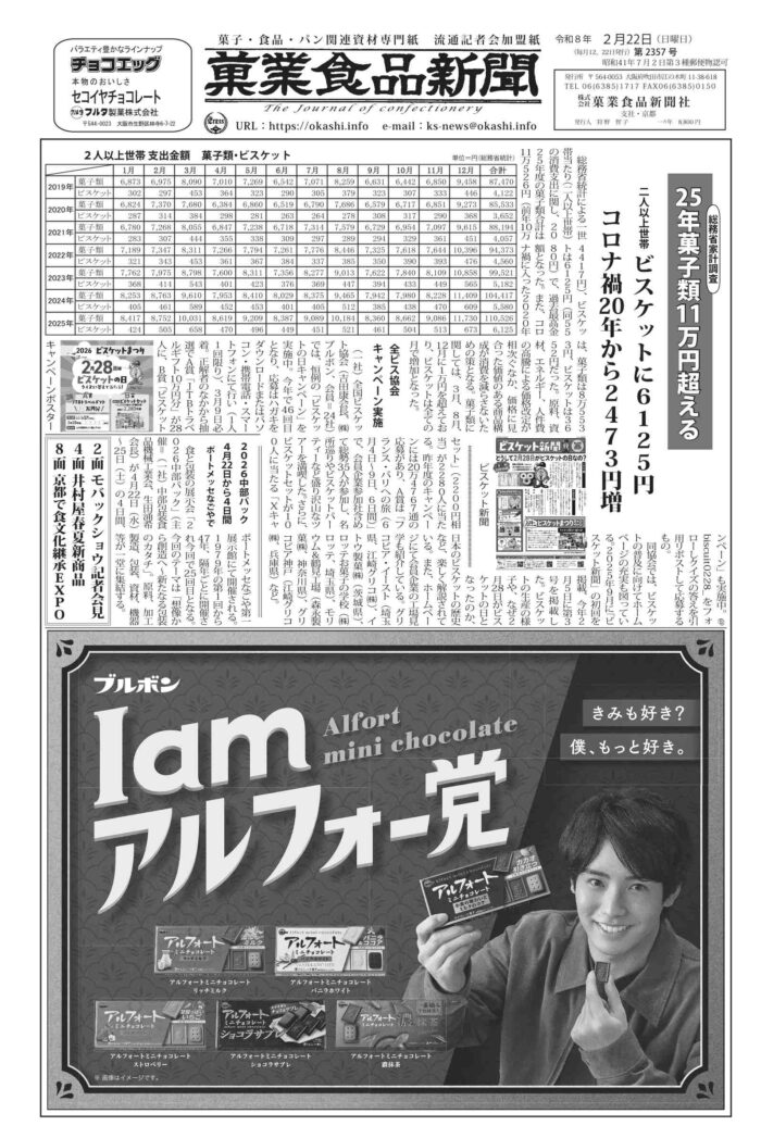 ホーム > 紙面紹介 > 2月22日号 2026/04/16 1面 ビスケット家計調査 2面 モバックショウ発表会 3面 長﨑堂お別れ会 4面 井村屋春夏新製品 5面 タジマヤランキング/大阪府和生菓子技能士会セミナー 6面 新製品 YBC、ギンビス、ビンズ、みゆき堂本舗、森永製菓 7面 京菓子協同組合新年会/吉田神社節分祭 8面 文化庁 食文化とわざの継承EXPO