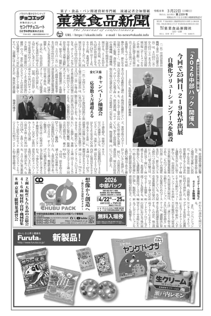 ホーム > 紙面紹介 > 3月22日号 2026/04/16 1面 中部パック記者会/全国ビスケット協会抽選会 2面 大阪産(もん)名品の会総会 3面 UHA味覚糖春夏向け新商品発表会 4面 原材料・機械・包装資材特集 5面 原材料・機械・包装資材特集 6面 原材料・機械・包装資材特集 7面 大阪府菓子工業組合講習会/新製品 ギンビス・三幸・フルタ 8面 京都煎餅組合総会