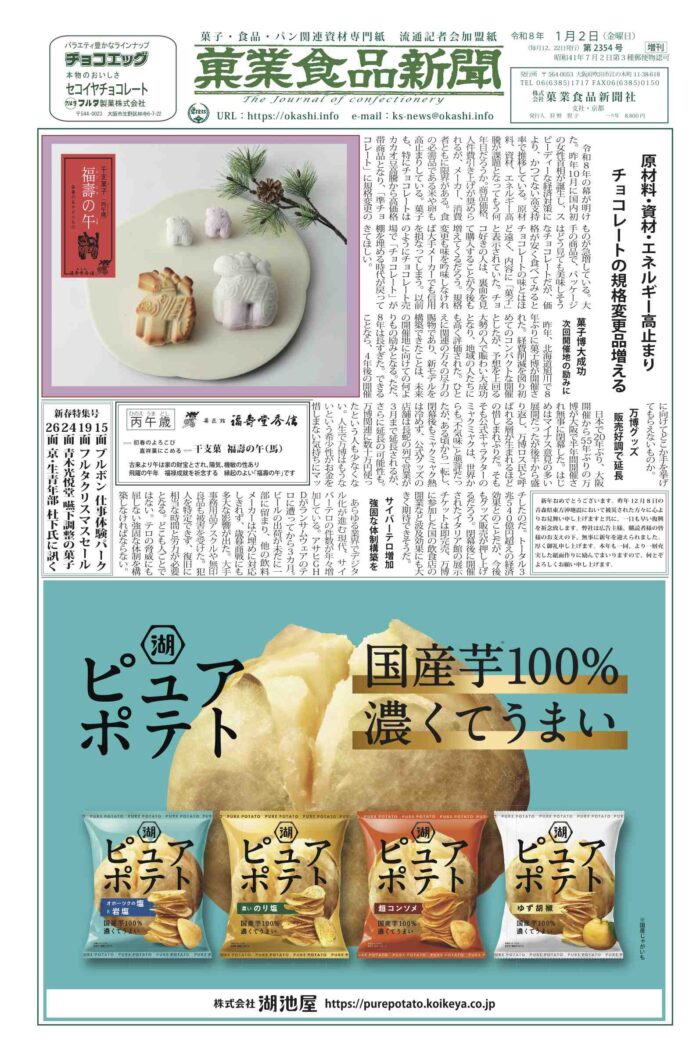 1月2日号 2026/02/17 1面 社説 2面~13面 年頭所感 14面 新商品 扇雀飴・ちぼり 15面 ブルボン カンドゥー大日 16面~22面 年頭所感 23面 亀屋良長・上賀茂神社「なんばん餅」 24面 青木光悦堂「おいしいお取り寄せ」 25面 上京区「和菓子の記憶と物語」 26面 京都府生菓子協同組合青年部部長 杜下氏インタビュー 27面 全面広告 28面 菓匠会